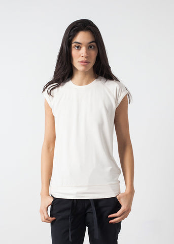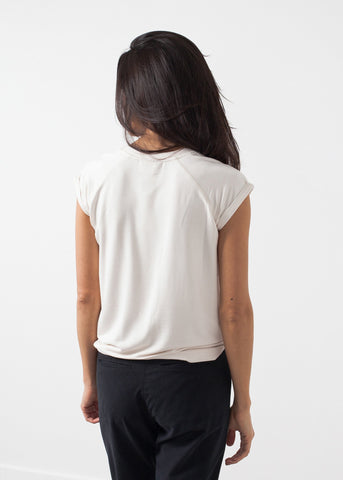 The comfort factor of the Fani Top from Malene Birger is unmistakable; cloud-like heaven. Crew neck with contrast sleeves and hems. Raglan sleeves. Color Cream. 95% Viscose, 5% Elastane. Ashley is wearing an X Small.