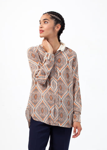 The Onvia Top offers a shapeless silhouette while engaging the eye. Hidden button placket at front. Mandarin collar. By Malene Birger. Color Orange Mosaic. 100% Silk, 100% Silk trim. Made in China. Ashley is wearing a European 36.